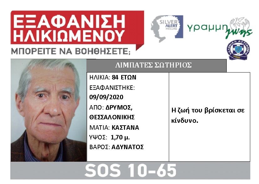 Σύμφωνα με ανακοίνωση της Γραμμής Ζωής Silver Alert, ο Λιμπάτες Σωτήριος έχει καστανά μάτια, ύψος 1,70μ και είναι πολύ αδύνατος. Η ζωή του βρίσκεται σε κίνδυνο.