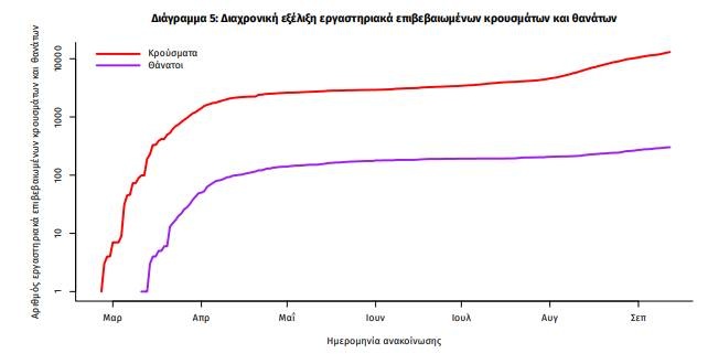 Η διαχρονική εξέλιξη των συνολικών κρουσμάτων και συνολικού αριθμού των θανάτων ασθενών COVID-19 παρουσιάζεται στο ακόλουθο διάγραμμα (σε λογαριθμική κλίμακα).