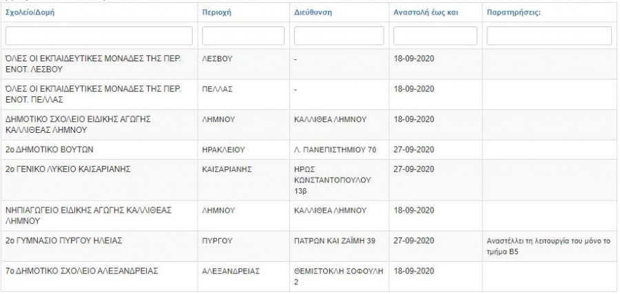 Όπως αναφέρεται στα σημερινά στοιχεία (16/9) του υπουργείου, κλειστά λόγω κορονοϊού είναι τα ακόλουθα σχολεία μέχρι τις ημερομηνίες που αναγράφονται: