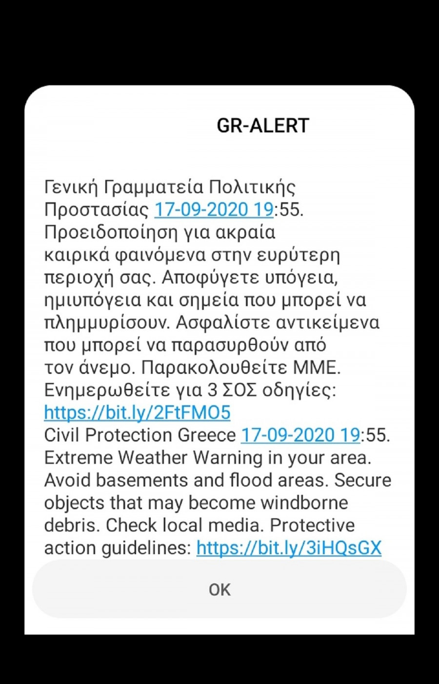 Μέσω του μηνύματος, η Γενική Γραμματεία Πολιτικής Προστασίας καλεί τους πολίτες να αποφύγουν υπόγεια, ημιυπόγεια και σημεία που μπορεί να πλημμυρίσουν, αλλά και να ασφαλίσουν αντικείμενα που μπορεί να παρασυρθούν από ανέμους.