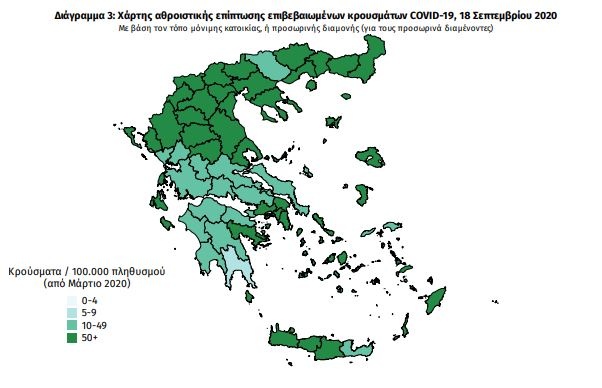 Ο χάρτης αποτυπώνει τη γεωγραφική κατανομή των συνολικών κρουσμάτων COVID-19 (από την αρχή της επιδημίας) ανά Περιφερειακή Ενότητα της χώρας, με βάση την δηλωθείσα διεύθυνση μόνιμης κατοικίας του ασθενούς, ή τη διεύθυνση προσωρινής διαμονής για τους τουρίστες και άλλους προσωρινά διαμένοντες στην Ελλάδα.