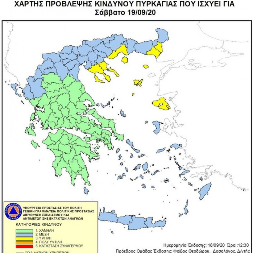 Φωτιές στην Ελλάδα - Όλες οι ειδήσεις: Σύμφωνα με το Χάρτη Πρόβλεψης Κινδύνου Πυρκαγιάς που εκδίδει η Γενική Γραμματεία Πολιτικής Προστασίας του Υπουργείου Εσωτερικών και Διοικητικής Ανασυγκρότησης, για σήμερα Σάββατο, 19 Σεπτεμβρίου, προβλέπεται υψηλός κίνδυνος πυρκαγιάς (κατηγορία κινδύνου 3), σε ορισμένες περιοχές της Ελλάδας.