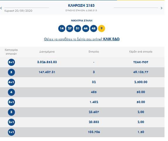 Οι τυχεροί αριθμοί που ανέδειξε η κληρωτίδα της αποψινής κλήρωσης είναι οι: 14, 27, 31, 44, 45 και Τζόκερ ο αριθμός 9.