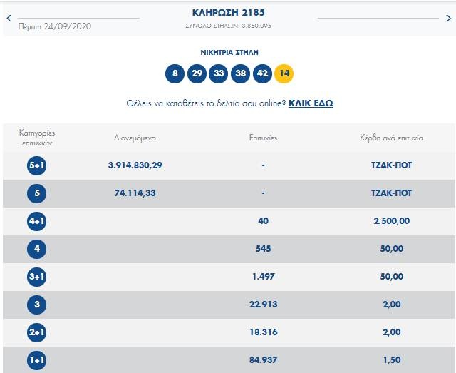 Οι τυχεροί αριθμοί που ανέδειξε η κληρωτίδα της αποψινής κλήρωσης είναι οι: 8, 29, 33, 38, 42 και Τζόκερ ο αριθμός 14.