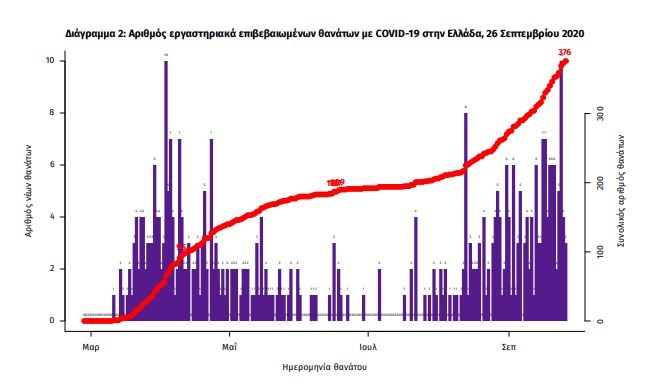 Τέλος, έχουμε 7 ακόμα καταγεγραμμένους θανάτους και 376 θανάτους συνολικά στη χώρα. 140 (37.2%) γυναίκες και οι υπόλοιποι άνδρες.