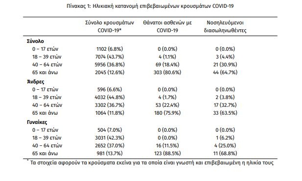 Η διάμεση ηλικία των θανόντων συμπολιτών μας ήταν τα 78 έτη και το 96.8% είχε κάποιο υποκείμενο νόσημα ή/και ηλικία 70 ετών και άνω.