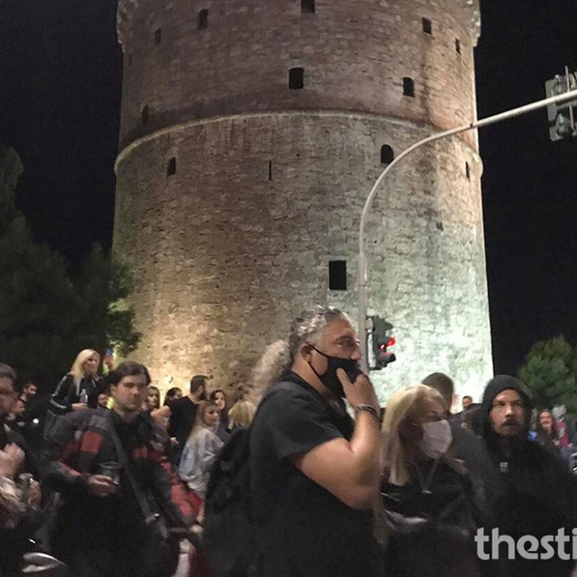 Οι καταστηματάρχες συγκεντρώθηκαν στο πλακόστρωτο του Λευκού Πύργου μετά το κλείσιμο των καταστημάτων τους τα μεσάνυχτα -τηρώντας τις αποστάσεις για την αποφυγή μετάδοσης του κορονοιου- για να διαμαρτυρηθούν για το περιορισμένο ωράριο λειτουργίας που έχει επιβληθεί σε νόμους της χώρας, λόγω της πανδημίας.