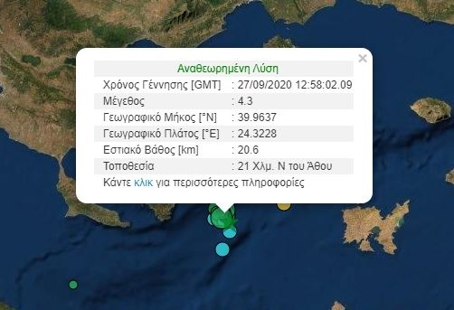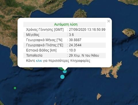 Το επίκεντρο του σεισμού εντοπίστηκε 18 χλμ. νότια νοτιοδυτικά του Άθω και το εστιακό του βάθος στα 18,6 χλμ.