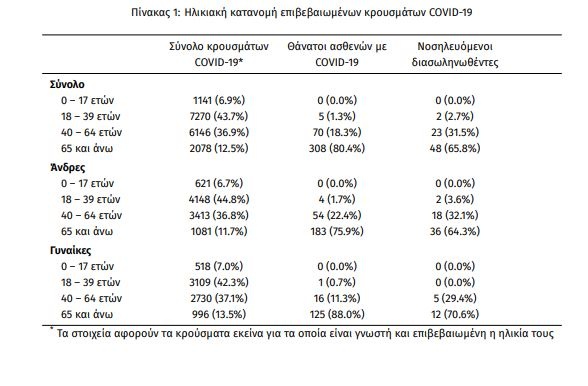 Η μέση ηλικία των κρουσμάτων είναι 39 έτη (εύρος 0 έως 102 ετών), ενώ η μέση ηλικία των θανάτων είναι 78 έτη (εύρος 25 έως 102 ετών). Η ηλικιακή κατανομή των (α) συνολικών κρουσμάτων, (β) των περιστατικών που κατέληξαν σε θάνατο και (γ) των ασθενών που νοσηλεύονται διασωληνωμένοι, είναι η ακόλουθη: