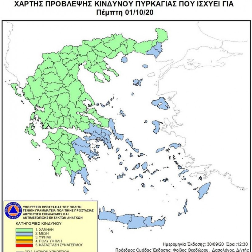 Φωτιές στην Ελλάδα - Όλες οι ειδήσεις: Σύμφωνα με το Χάρτη Πρόβλεψης Κινδύνου Πυρκαγιάς που εκδίδει η Γενική Γραμματεία Πολιτικής Προστασίας του Υπουργείου Εσωτερικών και Διοικητικής Ανασυγκρότησης, για σήμερα Πέμπτη, 1η Οκτωβρίου, προβλέπεται μέσος κίνδυνος πυρκαγιάς (κατηγορία κινδύνου 2), σε ορισμένες περιοχές της Ελλάδας.