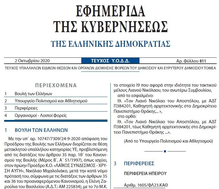 Το κείμενο στην Εφημερίδα της Κυβερνήσεως αναφέρει χαρακτηριστικά: «Με την υπ΄ αρ. 10747/7309/24-9-2020 απόφαση του Προέδρου της Βουλής των Ελλήνων διορίζεται σε θέση μετακλητού υπαλλήλου κατηγορίας ΥΕ, προβλεπόμενη από τις διατάξεις του άρθρου 35 παρ. 1θ΄ του Κανονισμού της Βουλής (Μέρος Β΄, Α΄ 51/1997), όπως ισχύει, στον πρώην Προέδρο Κ.Ο. "ΛΑΪΚΟΣ ΣΥΝΔΕΣΜΟΣ - ΧΡΥΣΗ ΑΥΓΗ", Νικόλαο Μιχαλολιάκο, μετά την κατά νόμο πρότασή του, σύμφωνα με τις διατάξεις των άρθρων 35 και 36 του προαναφερόμενου Κανονισμού, η Ελένη Ζαρούλια του Βασιλείου, με το 7ο Μ.Κ. όπως τούτο ισχύει για τους υπαλλήλους της Βουλής».