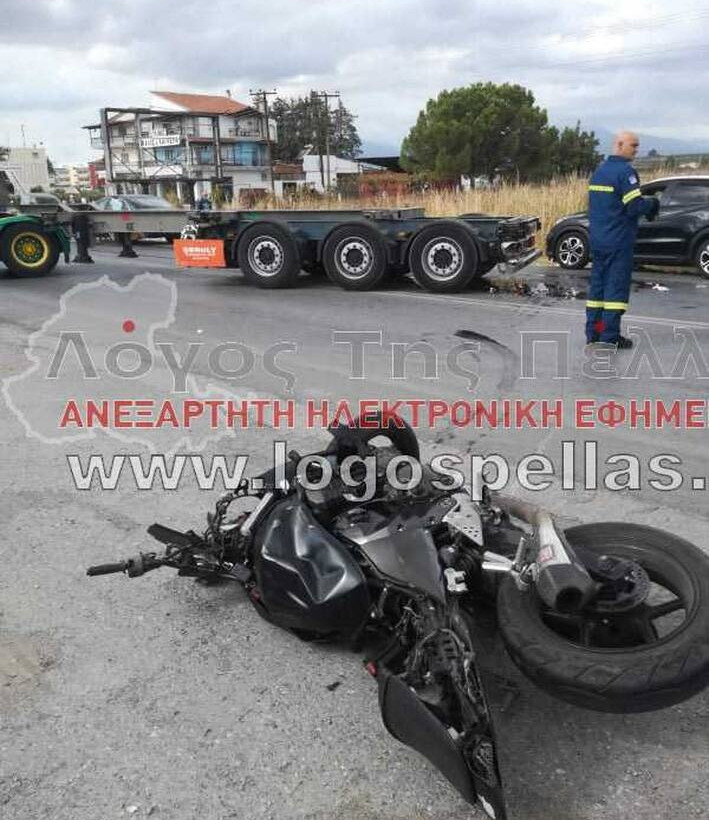 Μοτοσικλέτα που οδηγούσε 21χρονος, υπό συνθήκες που διερευνώνται, συγκρούστηκε πλαγιομετωπικά με ΙΧ φορτηγό, με αποτέλεσμα τον τραυματισμό του αναβάτη της μηχανής, ο οποίος μεταφέρθηκε στο νοσοκομείο των Γιαννιτσών και λίγη ώρα αργότερα κατέληξε.