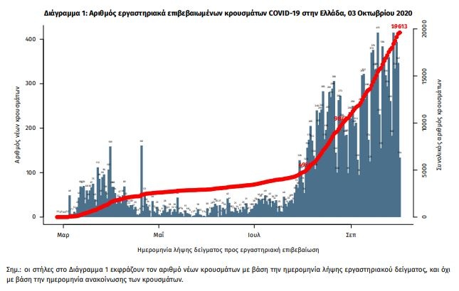 Τα νέα εργαστηριακά επιβεβαιωμένα κρούσματα της νόσου είναι 267, εκ των οποίων 22 συνδέονται με γνωστές συρροές και 25 εντοπίστηκαν κατόπιν ελέγχων στις πύλες εισόδου της χώρας. Ο συνολικός αριθμός των κρουσμάτων ανέρχεται σε 19.613 (ημερήσια μεταβολή +1.4%), εκ των οποίων 55.8% άνδρες.