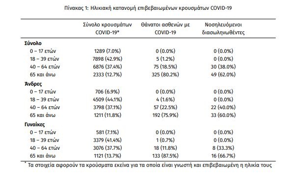 Η μέση ηλικία των κρουσμάτων είναι 40 έτη (εύρος 0 έως 102 ετών), ενώ η μέση ηλικία των θανάτων είναι 78 έτη (εύρος 25 έως 102 ετών). Η ηλικιακή κατανομή των (α) συνολικών κρουσμάτων, (β) των περιστατικών που κατέληξαν σε θάνατο και (γ) των ασθενών που νοσηλεύονται διασωληνωμένοι, είναι η ακόλουθη:
