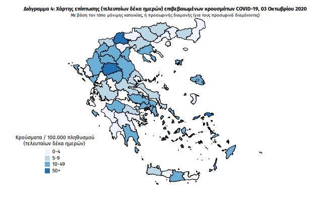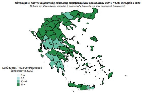 Ο χάρτης αποτυπώνει τη γεωγραφική κατανομή των συνολικών κρουσμάτων COVID-19 (από την αρχή της επιδημίας) ανά Περιφερειακή Ενότητα της χώρας, με βάση την δηλωθείσα διεύθυνση μόνιμης κατοικίας του ασθενούς, ή τη διεύθυνση προσωρινής διαμονής για τους τουρίστες και άλλους προσωρινά διαμένοντες στην Ελλάδα.