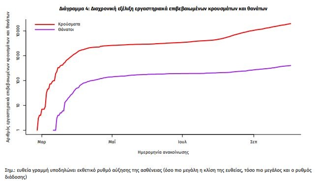 Η διαχρονική εξέλιξη των συνολικών κρουσμάτων και συνολικού αριθμού των θανάτων ασθενών COVID-19 παρουσιάζεται στο ακόλουθο διάγραμμα (σε λογαριθμική κλίμακα).