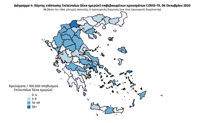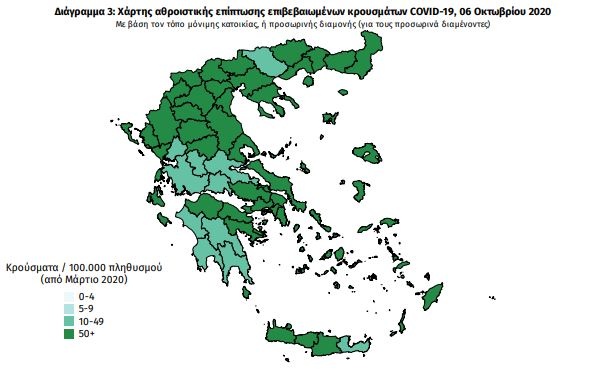 Ο χάρτης αποτυπώνει τη γεωγραφική κατανομή των συνολικών κρουσμάτων COVID-19 (από την αρχή της επιδημίας) ανά Περιφερειακή Ενότητα της χώρας, με βάση την δηλωθείσα διεύθυνση μόνιμης κατοικίας του ασθενούς, ή τη διεύθυνση προσωρινής διαμονής για τους τουρίστες και άλλους προσωρινά διαμένοντες στην Ελλάδα.