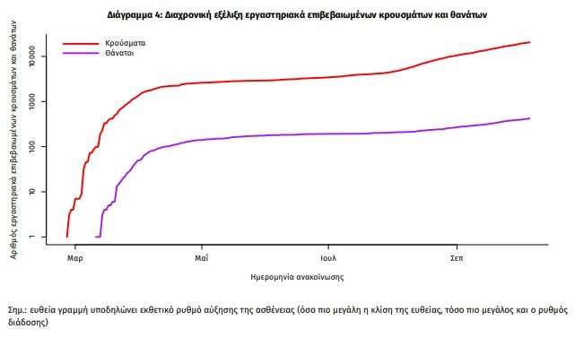 Η διαχρονική εξέλιξη των συνολικών κρουσμάτων και συνολικού αριθμού των θανάτων ασθενών COVID-19 παρουσιάζεται στο ακόλουθο διάγραμμα (σε λογαριθμική κλίμακα).