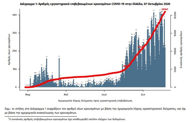 Τα νέα εργαστηριακά επιβεβαιωμένα κρούσματα της νόσου είναι 407, εκ των οποίων 56 συνδέονται με γνωστές συρροές και 25 εντοπίστηκαν κατόπιν ελέγχων στις πύλες εισόδου της χώρας. Ο συνολικός αριθμός των κρουσμάτων ανέρχεται σε 20.947 (ημερήσια μεταβολή +2.0%), εκ των οποίων 55.9% άνδρες.