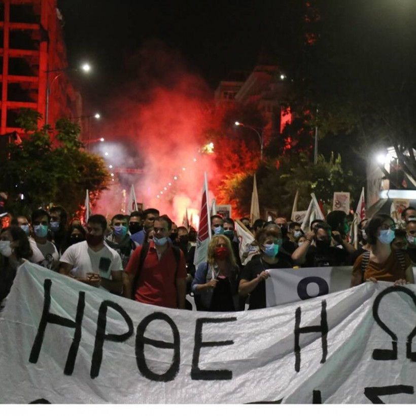 Ακολούθησε πορεία με κατεύθυνση τα γραφεία της Χρυσής Αυγής, η οποία σταμάτησε στο μπλόκο της Αστυνομίας στην αρχή της οδού Πολυτεχνείου, όπου οι διαδηλωτές έγραψαν στο οδόστρωμα με κόκκινο σπρέι: «Ο λαός απαιτεί, οι ναζί στη φυλακή». Τελικώς, επιτράπηκε στην πορεία να συνεχίσει ως το ύψος του Δικαστικού μεγάρου, απέναντι από τα γραφεία της Χ.Α. , όπου είχαν τοποθετηθεί κλούβες της αστυνομίας. Οι διαδηλωτές φώναξαν συνθήματα και η πορεία έστριψε αριστερά στην παραλιακή λεωφόρο με κατεύθυνση προς το κέντρο και ολοκληρώθηκε λίγο μετά την κεντρική πύλη του λιμανιού.