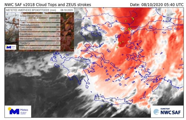Από τις πρωινές ώρες της Πέμπτης 08/10 το ψυχρό μέτωπο που είναι υπεύθυνο για τη μεταβολή του καιρού, επηρεάζει τα ανατολικά ηπειρωτικά τμήματα της χώρας και τα νησιωτικά τμήματα του Αιγαίου. Στη δορυφορική εικόνα που ακολουθεί απεικονίζεται το μέτωπο στις 08:40 το πρωί της Πέμπτης, ενώ με κίτρινους αστερίσκους σημειώνονται οι περιοχές όπου εκδηλώνονται καταιγίδες. Στην εικόνα περιέχεται ο πίνακας με τα 8 μεγαλύτερα ύψη βροχόπτωσης.