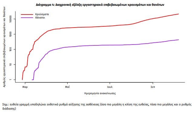 Η διαχρονική εξέλιξη των συνολικών κρουσμάτων και συνολικού αριθμού των θανάτων ασθενών COVID-19 παρουσιάζεται στο ακόλουθο διάγραμμα (σε λογαριθμική κλίμακα).