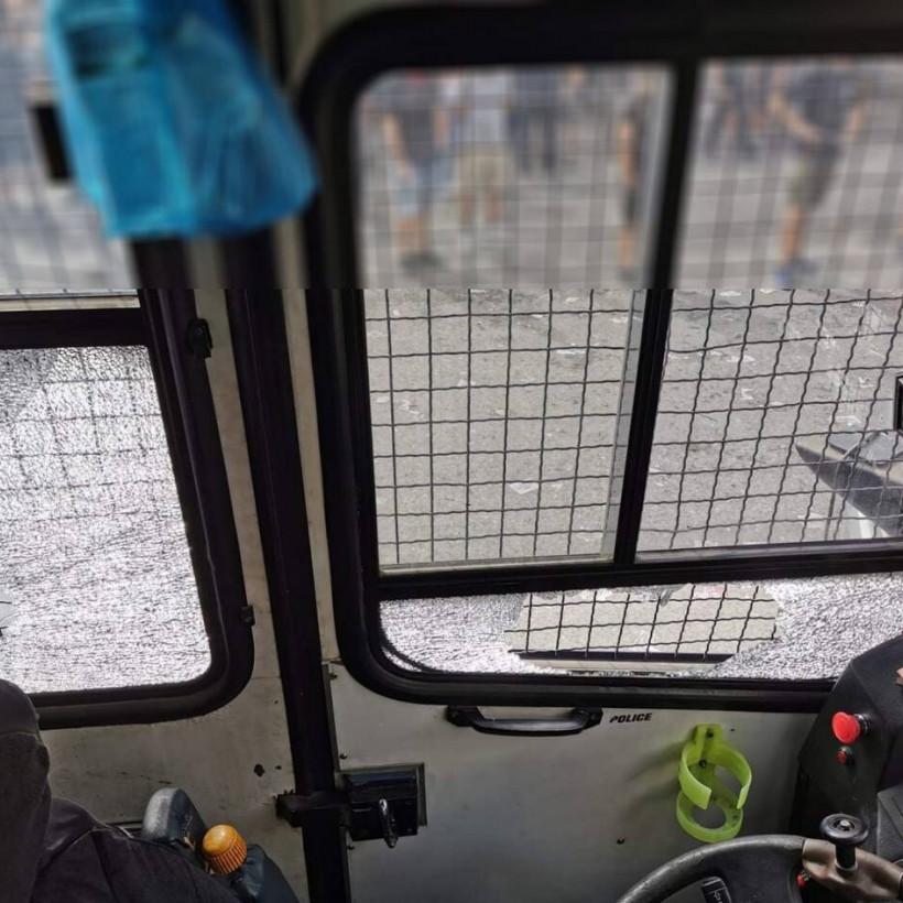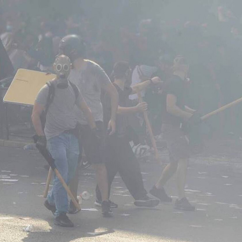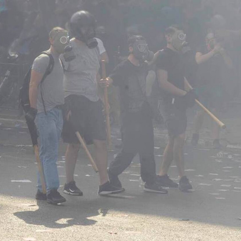 Στις άλλες φωτογραφίες, που είναι μετά την έναρξη των επεισοδίων, όπου σύμφωνα με χθεσινή ανακοίνωση εκτοξεύτηκαν περισσότερες από 150 βόμβες μολότοφ, διακρίνονται, εκτός των άλλων, πολίτες με μάσκες και ρόπαλα, καθώς και οι φθορές που έχουν προκληθεί στα αστυνομικά οχήματα.