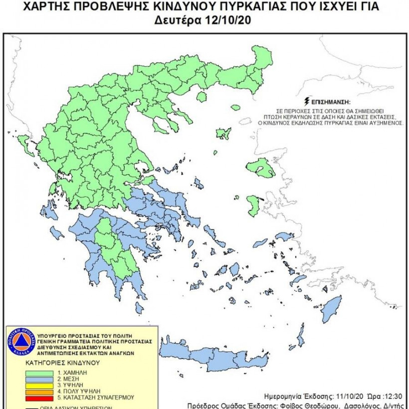 Φωτιές στην Ελλάδα - Όλες οι ειδήσεις: Σύμφωνα με το Χάρτη Πρόβλεψης Κινδύνου Πυρκαγιάς που εκδίδει η Γενική Γραμματεία Πολιτικής Προστασίας του Υπουργείου Εσωτερικών και Διοικητικής Ανασυγκρότησης, για σήμερα Δευτέρα, 12 Οκτωβρίου, προβλέπεται μέσος κίνδυνος πυρκαγιάς (κατηγορία κινδύνου 2), σε ορισμένες περιοχές της Ελλάδας.