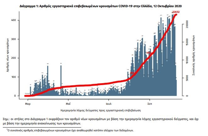 Δείγματα που έχουν ελεγχθεί: Από την 1η Ιανουαρίου 2020 μέχρι σήμερα, στα εργαστήρια που διενεργούν ελέγχους για τον νέο κορονοϊό (SARS-CoV-2) και που δηλώνουν συστηματικά στον ΕΟΔΥ το σύνολο των δειγμάτων που ελέγχουν, έχουν συνολικά ελεγχθεί 1.429.670 κλινικά δείγματα ενώ από Μονάδες Υγείας και Κλιμάκια του ΕΟΔΥ που διενεργούν ελέγχους Rapid Ag έχουν ελεγχθεί 25.817 δείγματα.