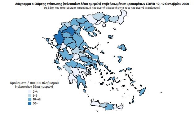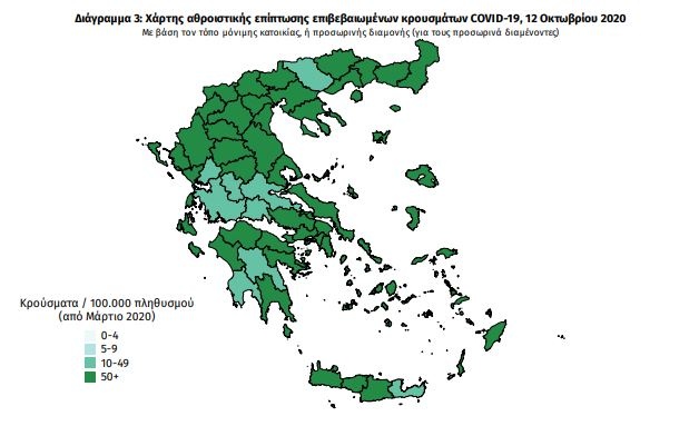 Ο χάρτης αποτυπώνει τη γεωγραφική κατανομή των συνολικών κρουσμάτων COVID-19 (από την αρχή της επιδημίας) ανά Περιφερειακή Ενότητα της χώρας, με βάση την δηλωθείσα διεύθυνση μόνιμης κατοικίας του ασθενούς, ή τη διεύθυνση προσωρινής διαμονής για τους τουρίστες και άλλους προσωρινά διαμένοντες στην Ελλάδα.