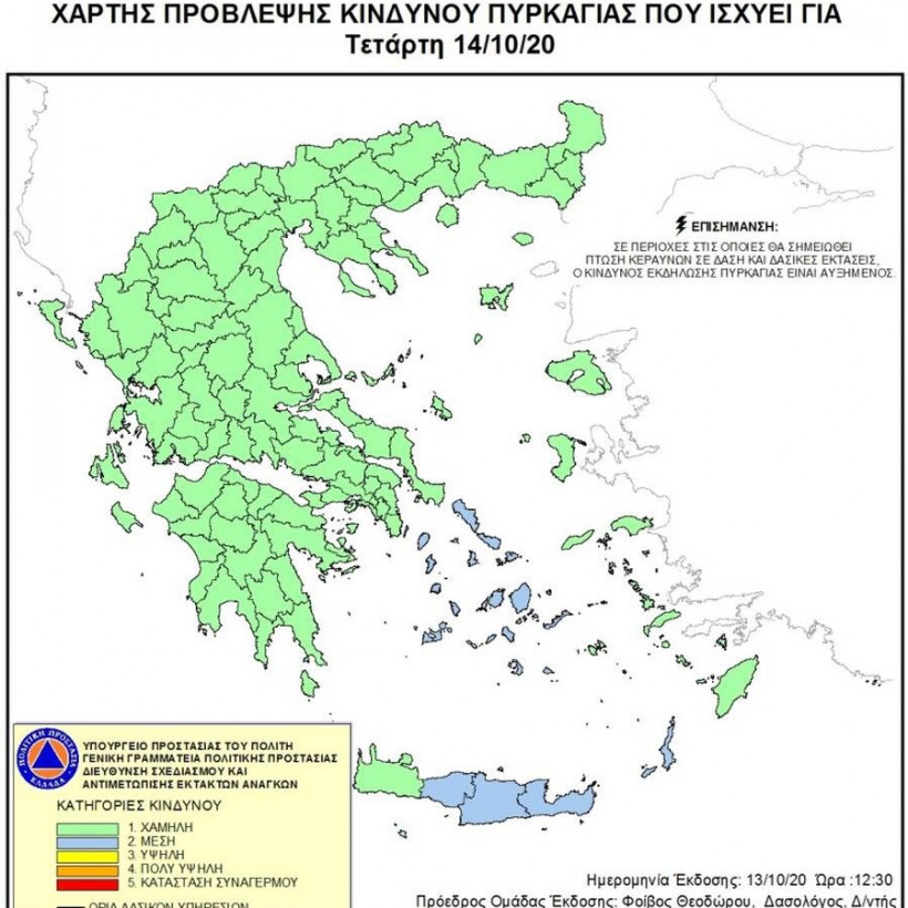 Φωτιές στην Ελλάδα - Όλες οι ειδήσεις: Σύμφωνα με το Χάρτη Πρόβλεψης Κινδύνου Πυρκαγιάς που εκδίδει η Γενική Γραμματεία Πολιτικής Προστασίας του Υπουργείου Εσωτερικών και Διοικητικής Ανασυγκρότησης, για σήμερα Τετάρτη, 14 Οκτωβρίου, προβλέπεται μέσος κίνδυνος πυρκαγιάς (κατηγορία κινδύνου 2), σε ορισμένες περιοχές της Ελλάδας.