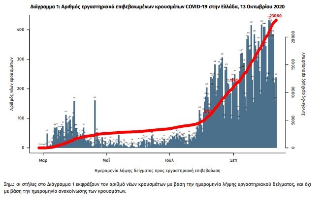 Τα νέα εργαστηριακά επιβεβαιωμένα κρούσματα της νόσου είναι 408, εκ των οποίων 58 συνδέονται με γνωστές συρροές και 45 εντοπίστηκαν κατόπιν ελέγχων στις πύλες εισόδου της χώρας. Ο συνολικός αριθμός των κρουσμάτων ανέρχεται σε 23.060 (ημερήσια μεταβολή +1.8%), εκ των οποίων 55.7% άνδρες.