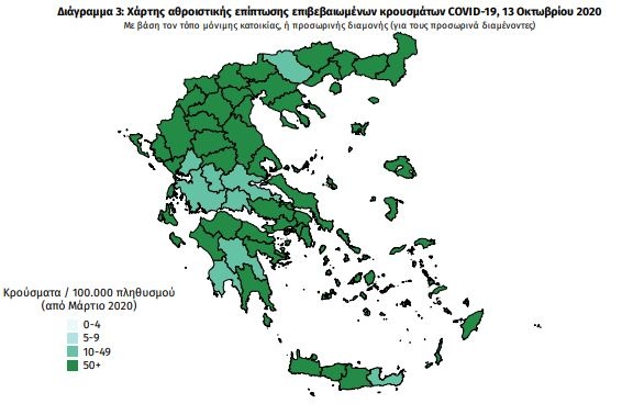 Ο χάρτης αποτυπώνει τη γεωγραφική κατανομή των συνολικών κρουσμάτων COVID-19 (από την αρχή της επιδημίας) ανά Περιφερειακή Ενότητα της χώρας, με βάση την δηλωθείσα διεύθυνση μόνιμης κατοικίας του ασθενούς, ή τη διεύθυνση προσωρινής διαμονής για τους τουρίστες και άλλους προσωρινά διαμένοντες στην Ελλάδα.
