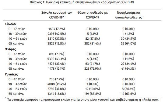 Η μέση ηλικία των κρουσμάτων είναι 40 έτη (εύρος 0 έως 102 ετών), ενώ η μέση ηλικία των θανάτων είναι 79 έτη (εύρος 25 έως 102 ετών). Η ηλικιακή κατανομή των (α) συνολικών κρουσμάτων, (β) των περιστατικών που κατέληξαν σε θάνατο και (γ) των ασθενών που νοσηλεύονται διασωληνωμένοι, είναι η ακόλουθη: