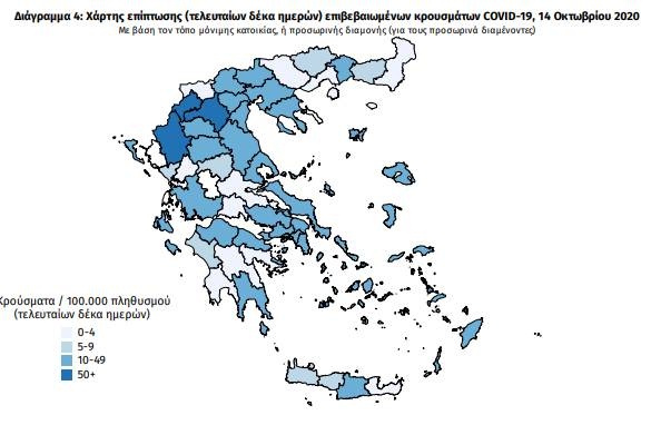 Ο χάρτης αποτυπώνει τη γεωγραφική κατανομή των συνολικών κρουσμάτων COVID-19 (από την αρχή της επιδημίας) ανά Περιφερειακή Ενότητα της χώρας, με βάση την δηλωθείσα διεύθυνση μόνιμης κατοικίας του ασθενούς, ή τη διεύθυνση προσωρινής διαμονής για τους τουρίστες και άλλους προσωρινά διαμένοντες στην Ελλάδα.