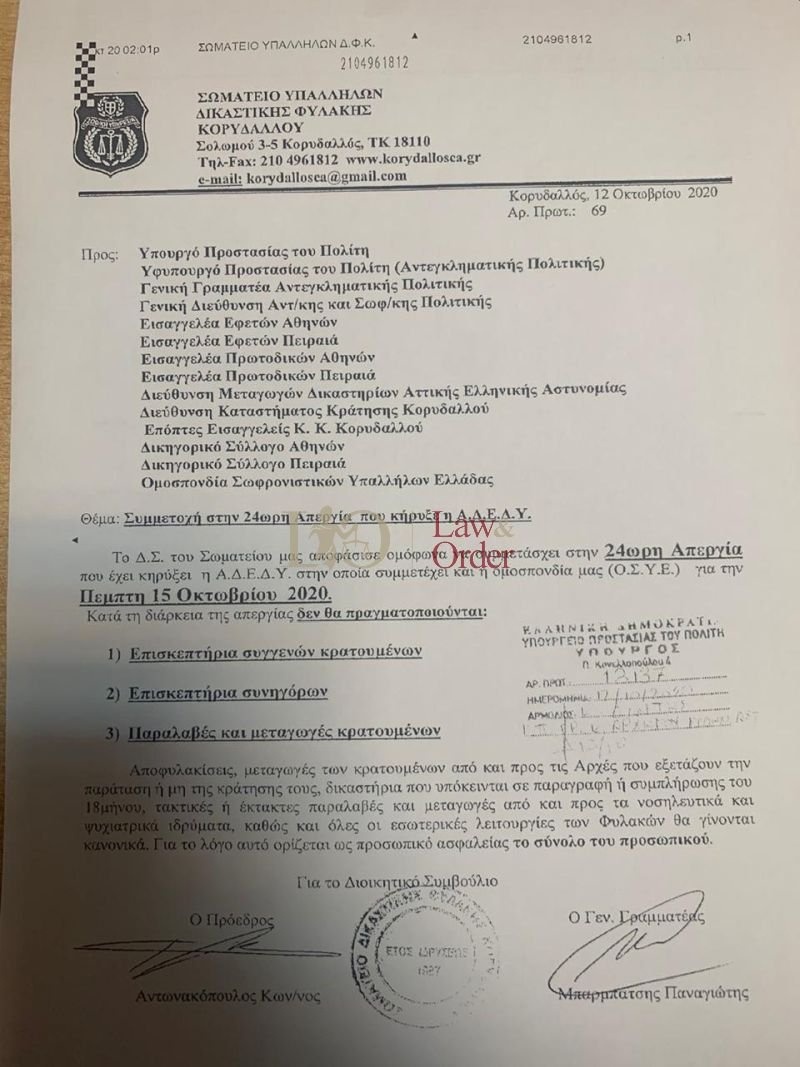 Στο έγγραφο που εστάλη από τις φυλακές του Κορυδαλλού προς το υπουργείο Προστασίας του Πολίτη και έχει στη διάθεσή του το Law&Order, φαίνεται ότι καθ' όλη τη διάρκεια της απεργίας, δεν θα μπορούν να πραγματοποιηθούν παραλαβές και μεταγωγές κρατουμένων.