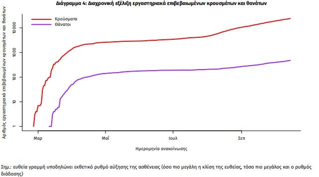 Η διαχρονική εξέλιξη των συνολικών κρουσμάτων και συνολικού αριθμού των θανάτων ασθενών COVID-19 παρουσιάζεται στο ακόλουθο διάγραμμα (σε λογαριθμική κλίμακα).