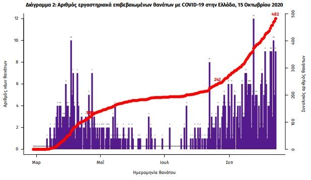 Οι νέοι θάνατοι ασθενών με COVID-19 είναι 13, ενώ από την έναρξη της επιδημίας έχουν καταγραφεί συνολικά 482 θάνατοι. Η διάμεση ηλικία των ασθενών που απεβίωσαν είναι 79 έτη. Ο αριθμός των ασθενών που νοσηλεύονται διασωληνωμένοι είναι 82 (70.7% άνδρες).