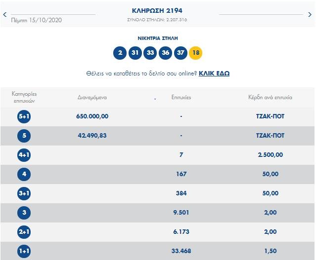 Οι τυχεροί αριθμοί που ανέδειξε η κληρωτίδα της αποψινής κλήρωσης είναι οι: 2, 31, 33, 36, 37 και Τζόκερ ο αριθμός 18.