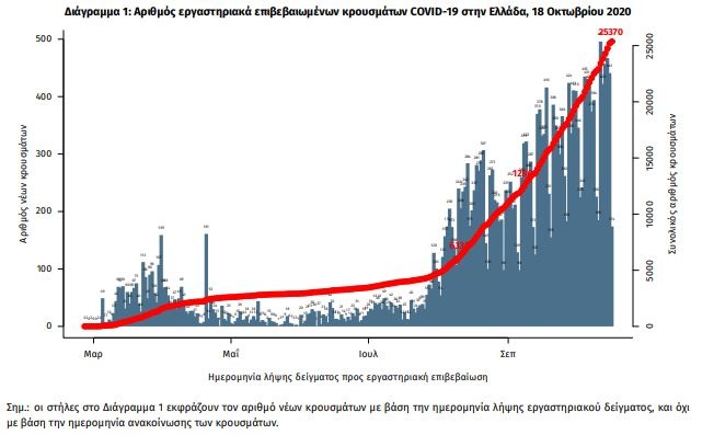 Τα νέα εργαστηριακά επιβεβαιωμένα κρούσματα της νόσου είναι 438, εκ των οποίων 32 συνδέονται με γνωστές συρροές και 28 εντοπίστηκαν κατόπιν ελέγχων στις πύλες εισόδου της χώρας. Ο συνολικός αριθμός των κρουσμάτων ανέρχεται σε 25.370 (ημερήσια μεταβολή +1.8%), εκ των οποίων 55.6% άνδρες.