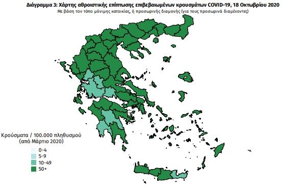 Ο χάρτης αποτυπώνει τη γεωγραφική κατανομή των συνολικών κρουσμάτων COVID-19 (από την αρχή της επιδημίας) ανά Περιφερειακή Ενότητα της χώρας, με βάση την δηλωθείσα διεύθυνση μόνιμης κατοικίας του ασθενούς, ή τη διεύθυνση προσωρινής διαμονής για τους τουρίστες και άλλους προσωρινά διαμένοντες στην Ελλάδα.