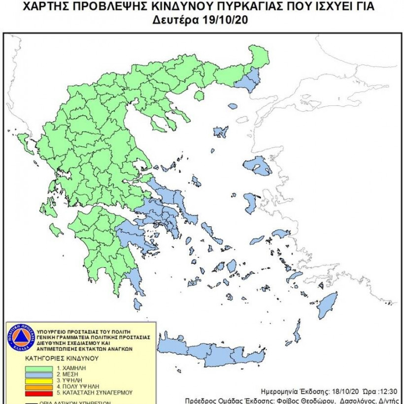 Φωτιές στην Ελλάδα - Όλες οι ειδήσεις: Σύμφωνα με το Χάρτη Πρόβλεψης Κινδύνου Πυρκαγιάς που εκδίδει η Γενική Γραμματεία Πολιτικής Προστασίας του Υπουργείου Εσωτερικών και Διοικητικής Ανασυγκρότησης, για σήμερα Δευτέρα, 19 Οκτωβρίου, προβλέπεται μέσος κίνδυνος πυρκαγιάς (κατηγορία κινδύνου 2), σε ορισμένες περιοχές της Ελλάδας.