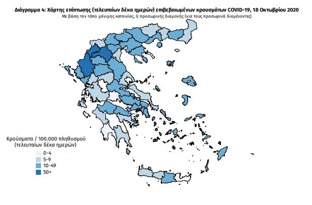 Ο χάρτης αποτυπώνει τη γεωγραφική κατανομή των συνολικών κρουσμάτων COVID-19 (από την αρχή της επιδημίας) ανά Περιφερειακή Ενότητα της χώρας, με βάση την δηλωθείσα διεύθυνση μόνιμης κατοικίας του ασθενούς, ή τη διεύθυνση προσωρινής διαμονής για τους τουρίστες και άλλους προσωρινά διαμένοντες στην Ελλάδα.