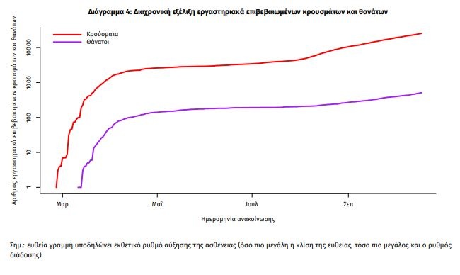 Η διαχρονική εξέλιξη των συνολικών κρουσμάτων και συνολικού αριθμού των θανάτων ασθενών COVID-19 παρουσιάζεται στο ακόλουθο διάγραμμα (σε λογαριθμική κλίμακα).