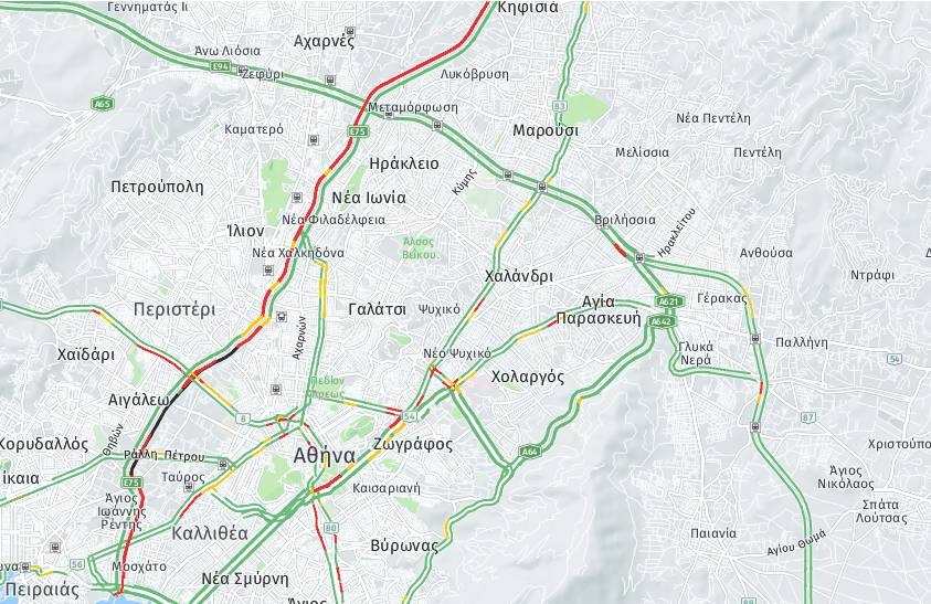 Εδώ και αρκετή ώρα τα οχήματα κινούνται με μικρές ταχύτητες, από το ύψος της Κηφισιάς έως και το Αιγάλεω.