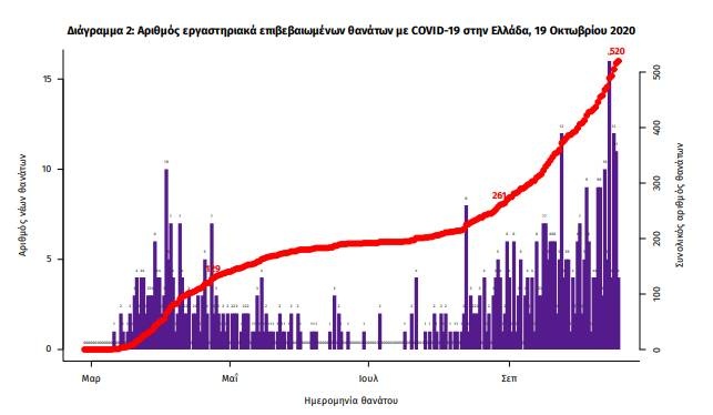 Τέλος, έχουμε 11 ακόμα καταγεγραμμένους θανάτους και 520 θανάτους συνολικά στη χώρα. Οι 197 (37.9%) γυναίκες και οι υπόλοιποι άνδρες. Η διάμεση ηλικία των θανόντων συμπολιτών μας ήταν τα 79 έτη και το 96.2% είχε κάποιο υποκείμενο νόσημα ή/και ηλικία 70 ετών και άνω.