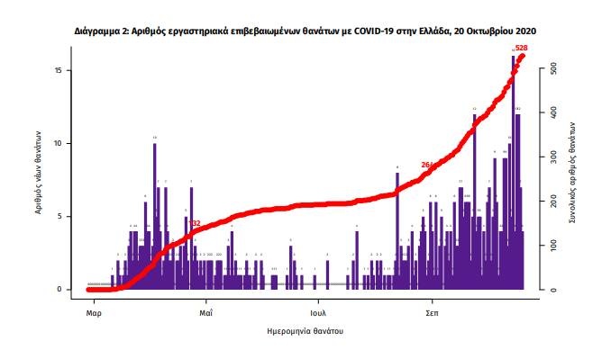 Τέλος, έχουμε 8 ακόμα καταγεγραμμένους θανάτους, σύμφωνα με την ενημέρωση του ΕΟΔΥ, ωστόσο ο αριθμός των νεκρών μέχρι το βράδυ της Τρίτης, έφτασε τους 531. Οι 199 (37.7%) γυναίκες και οι υπόλοιποι άνδρες. Η διάμεση ηλικία των θανόντων συμπολιτών μας ήταν τα 79 έτη και το 96.2% είχε κάποιο υποκείμενο νόσημα ή/και ηλικία 70 ετών και άνω.
