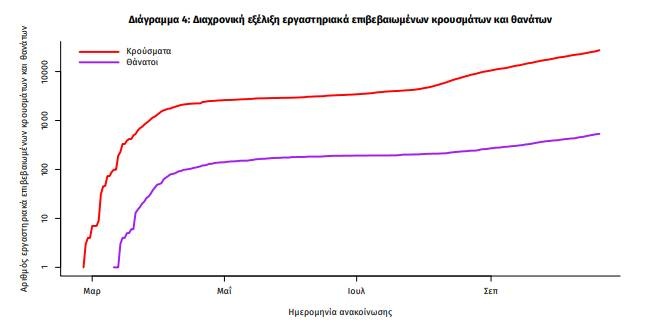 Η διαχρονική εξέλιξη των συνολικών κρουσμάτων και συνολικού αριθμού των θανάτων ασθενών COVID-19 παρουσιάζεται στο ακόλουθο διάγραμμα (σε λογαριθμική κλίμακα).