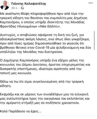 «Με νίκησε ο κοροναϊός» αναφέρει στο σπαρακτικό γράμμα που άφησε λίγο πριν αυτοκτονήσει ο ιδιοκτήτης του γηροκομείου στον Άγιο Στέφανο, Δημήτρης Καμπανάρος.