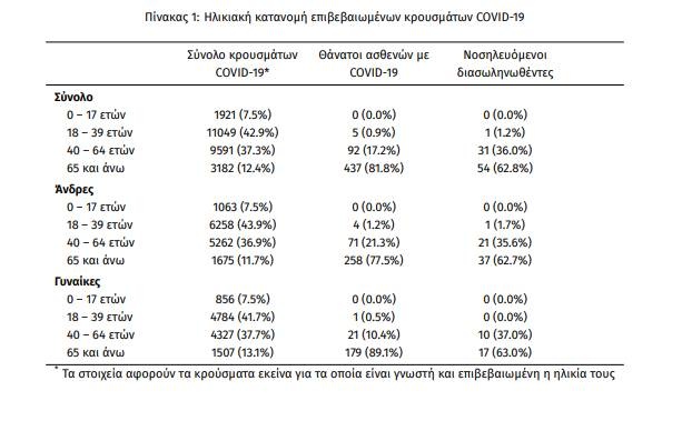 Τέλος, έχουμε 6 ακόμα καταγεγραμμένους θανάτους και 534 θανάτους συνολικά στη χώρα. 201 (37.6%) γυναίκες και οι υπόλοιποι άνδρες. Η διάμεση ηλικία των θανόντων συμπολιτών μας ήταν τα 79 έτη και το 96.3% είχε κάποιο υποκείμενο νόσημα ή/και ηλικία 70 ετών και άνω.